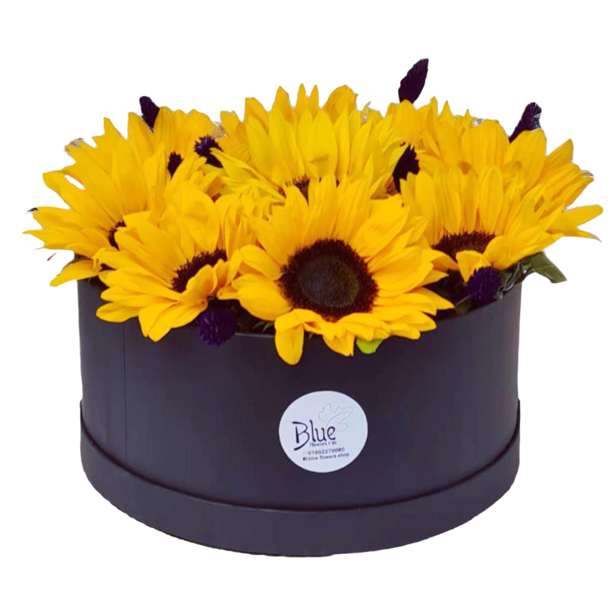 A striking arrangement of vibrant sunflowers accented with delicate purple blooms, presented in a sleek black box. This cheerful design embodies positivity, energy, and warmth, making it a perfect gift to brighten someone’s day.