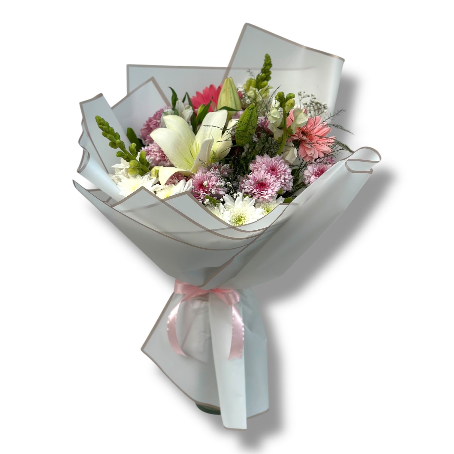 A soothing arrangement of pastel pink gerberas, white chrysanthemums, and lilies, delicately wrapped in sheer white paper. Ideal for conveying grace and heartfelt sentiments.