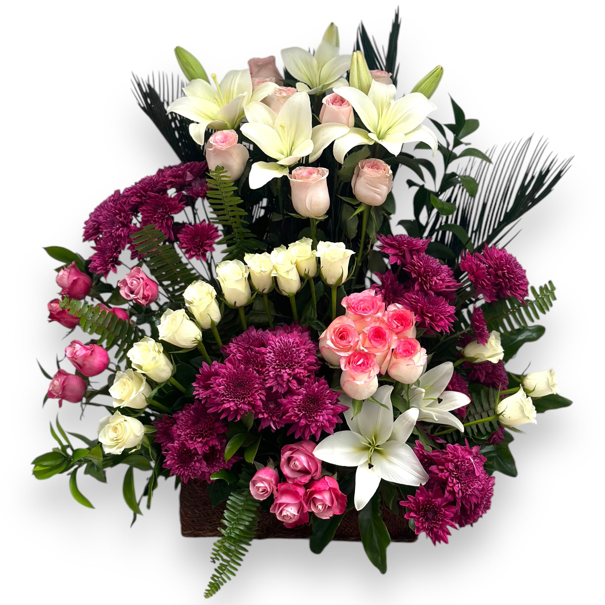 The "Elegance in Bloom" bouquet is a striking arrangement that features a lovely mix of white lilies, soft pink roses, classic white roses, and rich dark purple chrysanthemums. Accented with lush green foliage, this vibrant bouquet is perfect for any occasion, from weddings to heartfelt gifts. Radiating charm and sophistication, "Elegance in Bloom" captures the essence of nature’s beauty in a stunning display.