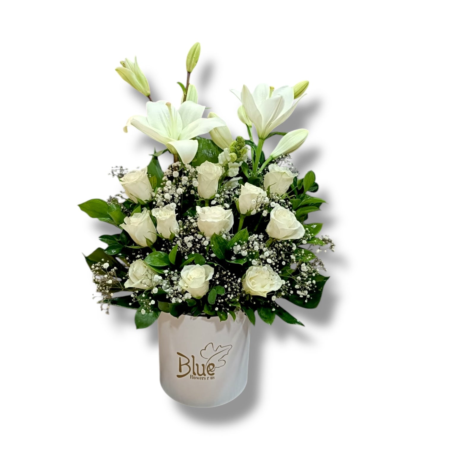 A graceful arrangement of pure white lilies and roses accented with delicate baby’s breath in a sleek white vase. This bouquet embodies purity, peace, and timeless elegance, making it an ideal gift for special moments.