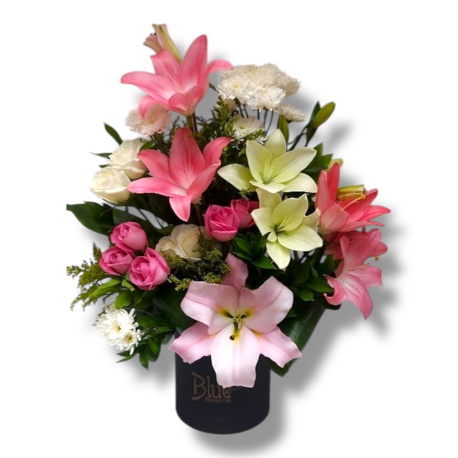 A delightful combination of pink lilies, white carnations, and soft pink roses presented in an elegant black vase. This bouquet is a stunning expression of sophistication and warmth, perfect for any occasion.