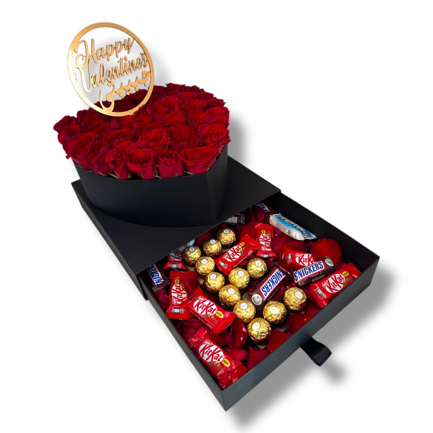 A heart-shaped box brimming with red roses and a hidden drawer filled with chocolates, making it an unforgettable Valentine’s gift.
