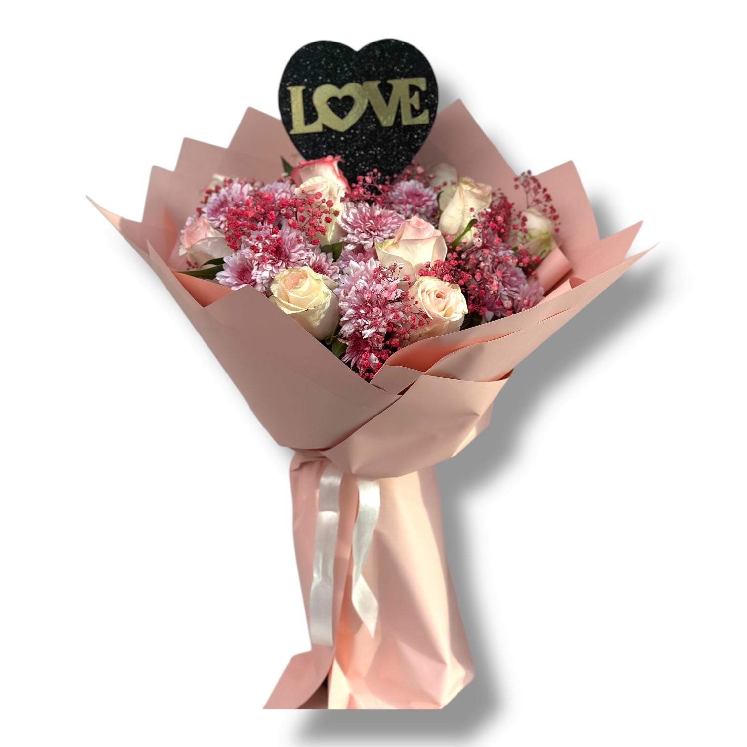 A sweet combination of delicate pink roses, lavender chrysanthemums, and baby’s breath, wrapped in soft pink paper with a heart-shaped “Love” topper. A charming way to express your affection.