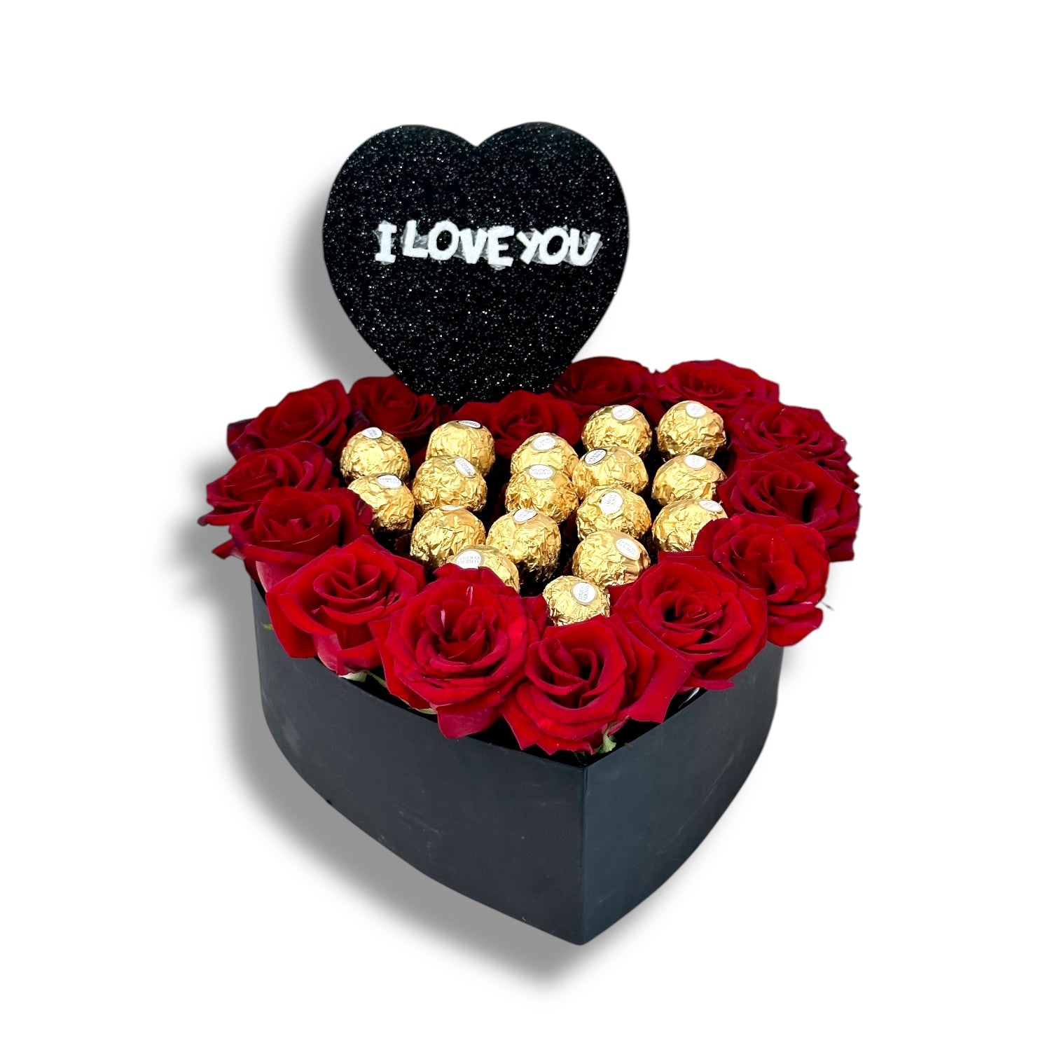 A heart-shaped box overflowing with vibrant red roses and golden chocolates, topped with a heartfelt “I Love You” sign. This exquisite gift is the ultimate way to express love and affection.