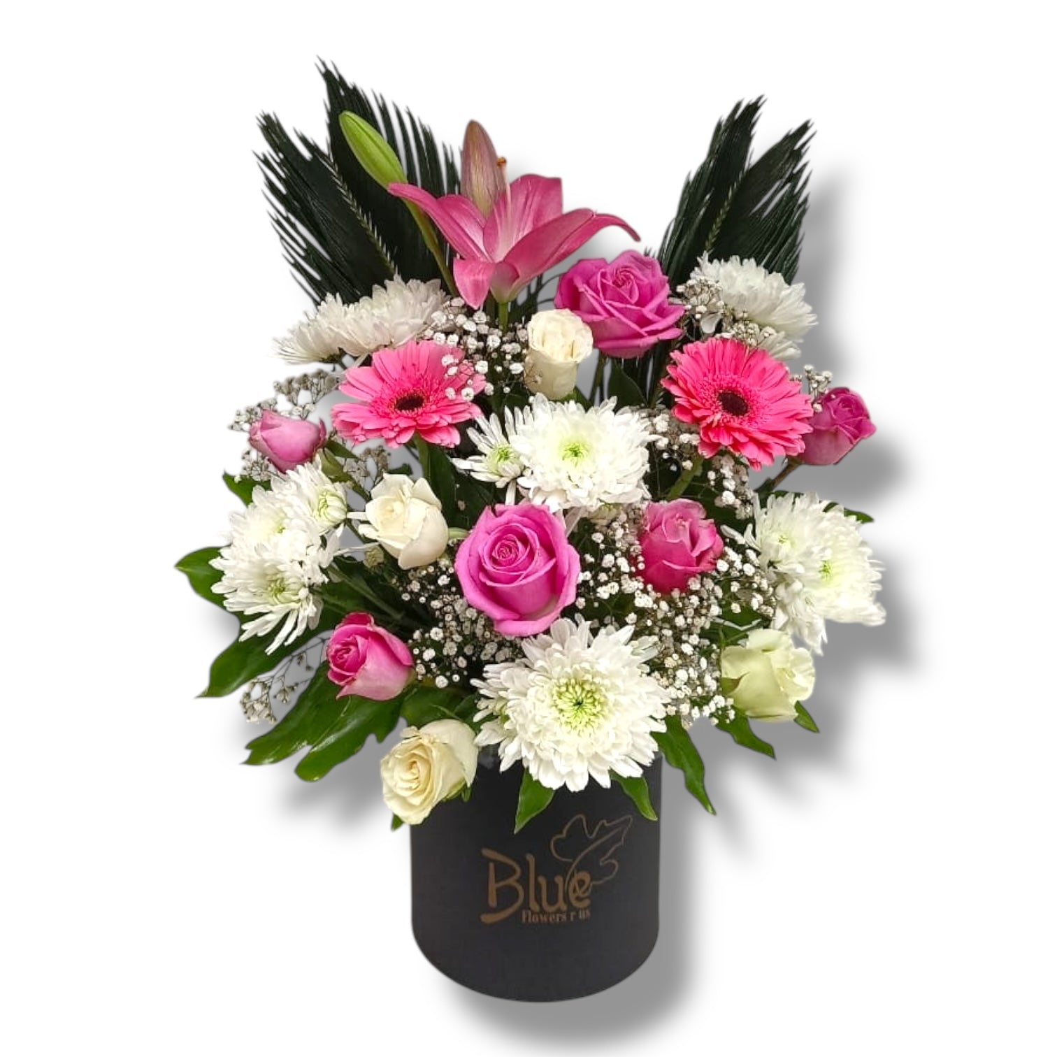 A charming arrangement of pink gerberas, roses, and white blooms nestled with lush greenery in a sleek black vase. This bouquet radiates balance, joy, and elegance, perfect for any occasion.