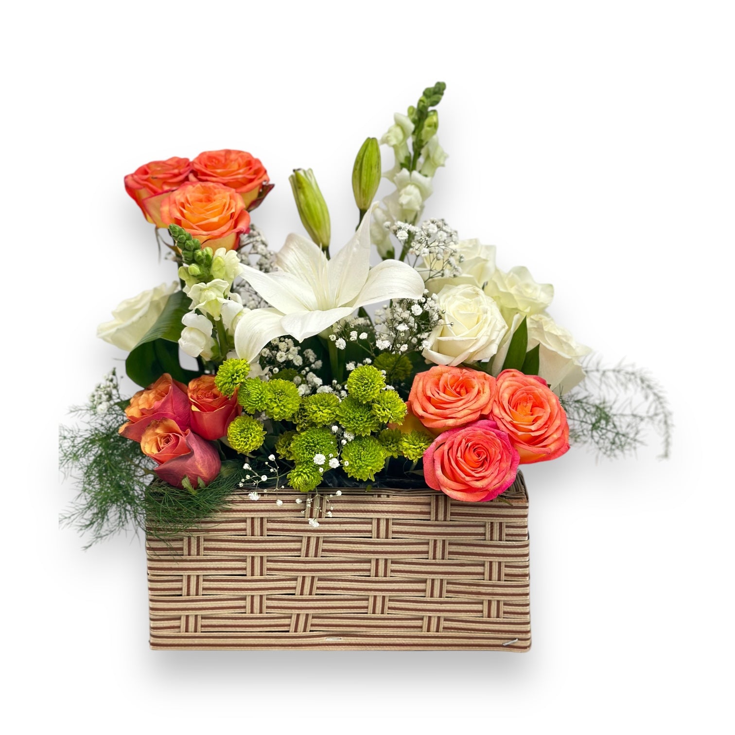 A radiant basket arrangement featuring vibrant orange roses as the centerpiece, surrounded by the luminous beauty of white lilies and white roses. Accented with lush greenery, this bouquet captures the warmth and brilliance of the sun, bringing light and joy to any space.