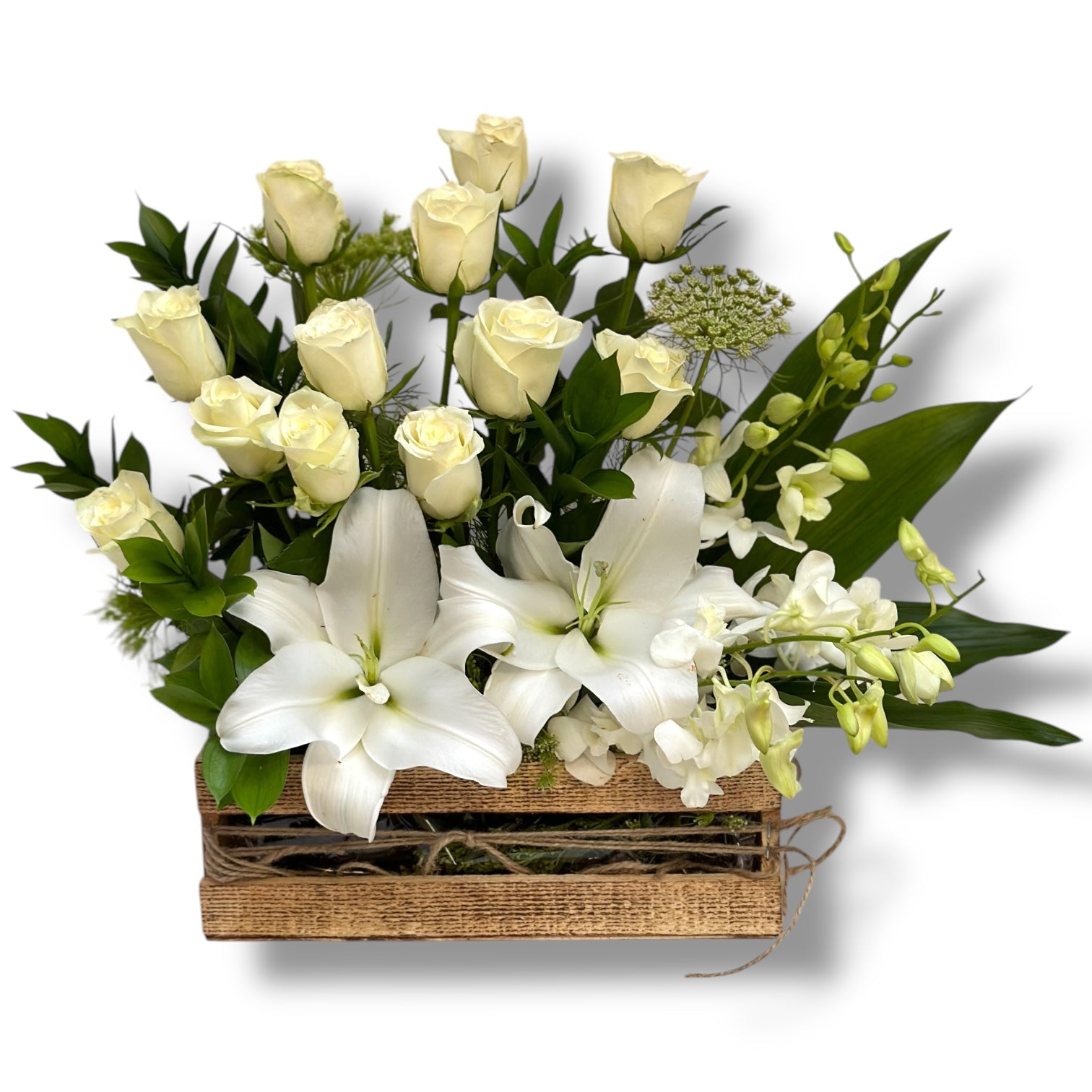 A stunning arrangement of elegant white roses, lilies, and orchids in a rustic wooden crate. This design symbolizes purity and peace, making it an ideal Ramadan gift or centerpiece for a serene and spiritual atmosphere.